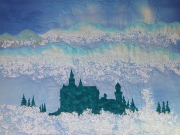 #2576 Hand painted and commercial fabrics, appliqued and free motion stitching. 16" x 12"