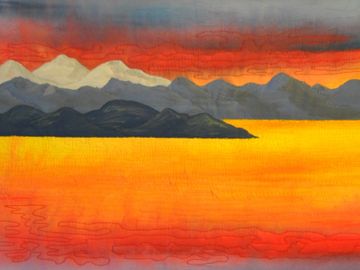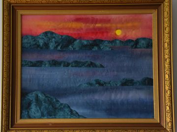 #2940 Hand painted and commercial fabrics, appliqued and free motion stitching. No mat, thin silver frame. Finished 20" x 16"